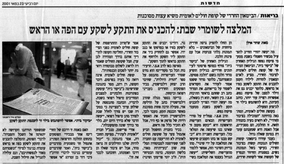 הצביעות אינה נחה בשבת בעיות בתקציב? תחבורה ציבורית בשבת תחסוך מיליארדים כפיה דתית למה שלא תעשה אצלי שבת? על פשרות שדתיים מוכנים להן בלי הבדל דת גזע ומין רכבת המחשבות "חילול" שבת? חילוניים אינם "מחללים" שבת השבת שמרה על עם ישראל?! גם המצלמות נדרשו להמנע מ"חילול" השבת! הטורבינה והשבת תנובה הציבה מצלמות ברפתות לוודא שאין "חילול" שבת (יומן חופש - אוקטובר 1999) בירושלים לא יחגגו את כניסת שנת 2000 מחשש ל"חילול" שבת (יומן חופש - יולי 1998) ביקור האפיפיור יגרום ל"חילול" שבת המוני (יומן חופש - פברואר 2000) המשטרה מנתקת את גלאי המתכות בכניסות לכותל מחשש ל"חילול" שבת (יומן חופש - ספטמבר 1998) המלצת הביטאון החרדי של קופת חולים לאומית לשומרי שבת: להכניס תקע לשקע עם הפה או הראש עשרות חרדים תקפו תיירים במאה שערים בערב שבת (יומן עבריינות - יולי-אוגוסט 2000) חרדים פצעו שוטרים באבנים במהלך הפגנה בערב שבת (יומן עבריינות - נובמבר-דצמבר 2002) אני גם זוכרת את הפעם הראשונה שבה "חיללתי" שבת. הרגשתי נורא מוזר, אבל גם נורא טוב. כאילו עשיתי נא לשמים. כאילו ניצחתי אותם. (מתוך סיפור היציאה בשאלה של שרה)