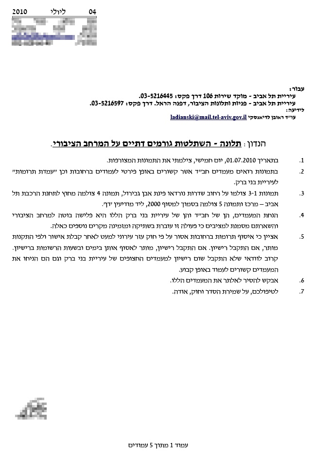 בתאריך 04.07.2010 שלח נציג 'חופש' לעיריית תל אביב את המכתב שלהלן: