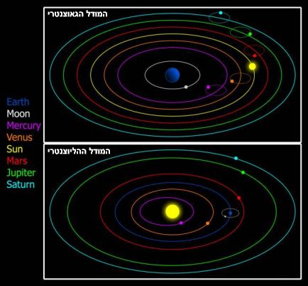בשירטוט הזה - בחלק העליון - כדור הארץ במרכז, ובחלק התחתון - השמש במרכז.