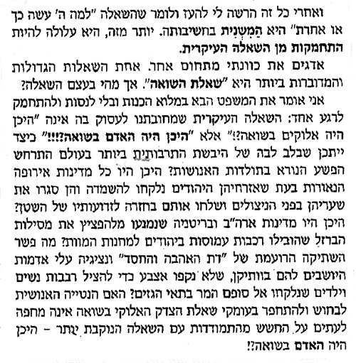 היה אלוהים בשואה", שהיא שאלת ששת המיליונים, ששום מאמין דתי לא נתן תשובה כנה והוגנת לגביה, וכל הדיון בשאלת ההטעייה "היכן היה