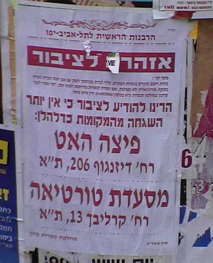 והנה - כיום הפיצריה פתוחה במוצ"ש וראה זה פלא היא מלאה בלקוחות ויהוה שבשמיים מתעלם מודעות החרם הנזעמות של הרבנות.
