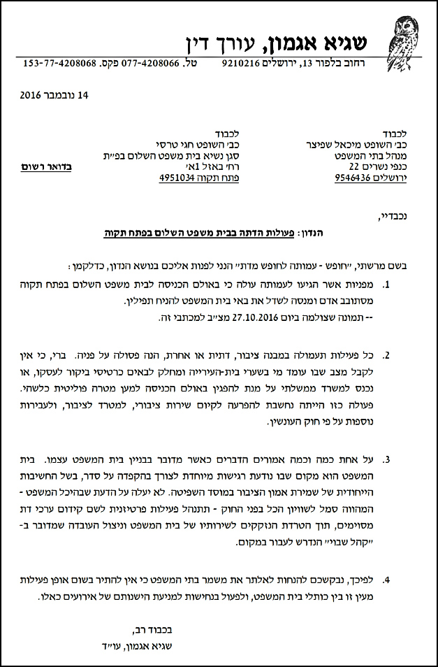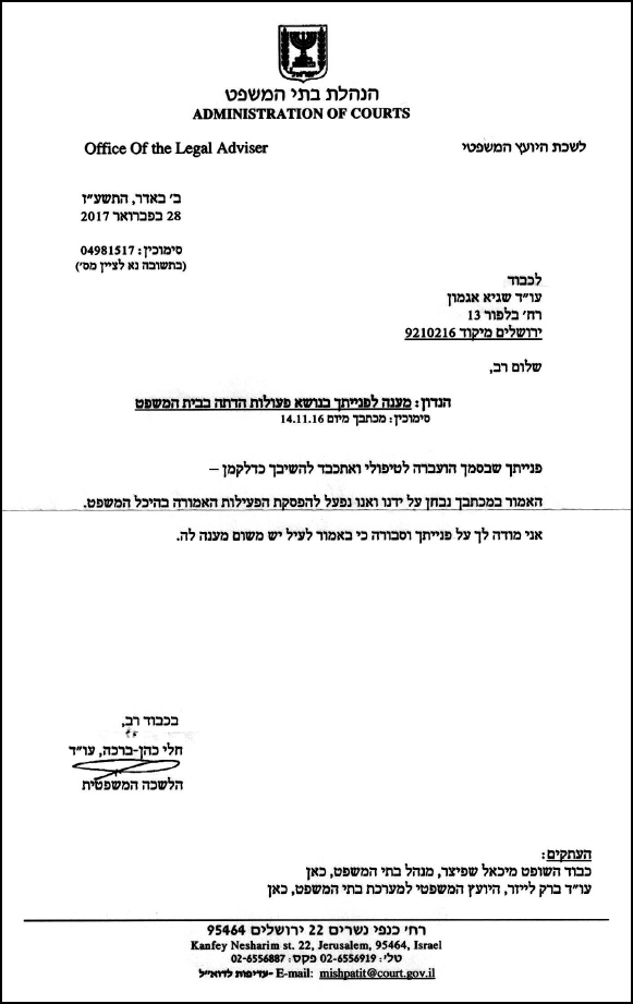 בעקבות המקרה שלחנו את המכתב הבא להנהלת בתי המשפט:
