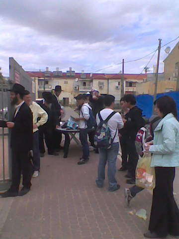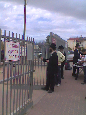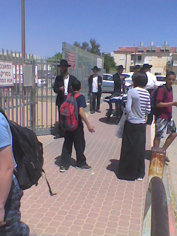 כבר שמעתי ממנו שיש חרדים בשער בית הספר כל יום שישי, אבל נדהמתי מעוצמת פעילותם. דוכן במרחק מספר מטרים מהשער זה עוד סביר, אבל השולחן שלהם עומד צמוד לגדר בית הספר, ונציגיהם (אשה וגבר) עומדים בתוך השער שרוחבו כמטר, כך שכל תלמיד מוכרח להתחכך בהם ולעמוד בחקירה: "אחי / צדיק האם הנחת תפילין היום?". ראו תמונות מצורפות איך הם עומדים בתוך השער (זה השער היחיד לבית הספר).