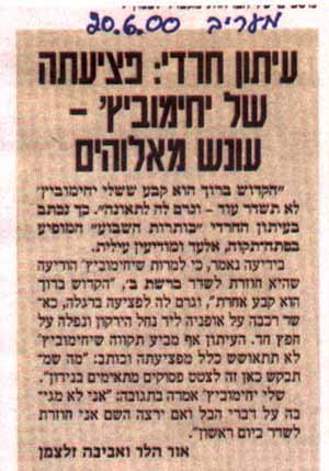קר .תועובשה גחב לייטל קרב הלשממה שאר לש ותאירק דגנ םיחומ ס"שב :(מ) 7.6 ,יאלקח גח אוה ורוקמב תועובשה גחש ,לארשי יחרזא ראשלו שפוח יארוקל ריכזהל תיבל וב עיגהל םיווצמ לארשי ינב ויה הרותה תווצמבש ,םילגרה תשולשמ דחא םהש ומכ גחה תא םמצעל וסכינ םייתדה .רבד ותוא הז - לייטל - עיגהל .שדקמה םג ומכ ,תדל רשק אלל ,ולוכ םעה תלחנ דימת ויהו םניהש םירבד ינימ לכ םיסכנמ .דועו ,יברעמה לתוכה רודיס טלחהב הזו ,העתפה אל וז .םילשוריל ןופצמ שדח ידרח בושיי ךנחנ :(מ) 7.6 תטילק תרשאמ אל בושייה לש הלבקה תדעו :תרחא איה העתפהה .יבויחו חלצומ איה הביסה .שוקשק ."םתנומאב םיקזח קר םילבקתמ" הנעטב ,הבושתב םירזוח .טלחהב תרכומ איהו ,ןיטולחל תרחא םילשוריב תירבעה הטיסרבינואה לש םיטנדוטסה תדוגאו ישפוח םע תתומע :(ה) 8.6 םומינימ תחטבהכ תותדה דרשמ םלשמש םולשתה תא לטבל השירדב ץ"גבל ורתע .המוד הכימת םילבקמ םניא םהש םושמ ,הילפאל םינעוט םירתועה .םיללוכ יכרבאל הרוגס םילשוריב הקיתעה ריעהש וזירכה םידרחה לש תועינצה תרמשמ :(ה) 8.6 דחא בלש איה וז הזרכה ,ידרח רוקמ ירבדל ."לודגה ןוקיתה" תפוקתב םישנל םישנל םידרפנ םיליבש ןיקתהל (רוג תודיסח) ץיבונרפס ברה לש הלודג תינכתב .םינימה ינש ןיב עגמ לכ עונמל ,לתוכה תבחרב םירבגלו םייח ןבא דסומהו (םתור הוונ תשרפ - רתאב האר) לילבוב לאפר ברה :(מ) 11.6 תיב תריגסל לעופ אוה יכ ךוניחה רש תא םימישאמ צ"גבל הריתעב הנח סדרפב התרחש ,צרמ תא םדקל ןוצרו םייטילופ-םיישיא םילוקיש לשב" דסומה לש רפסה המו ,רבדמש ימ ."לארשי ידליל יתד-ידוהי ךוניח לש ןממס לכ תפידר הלגד לע תינכת" תרגסמב התשענ רפסה תיב תריגסש איה ךוניחה דרשמ תבושת .רבדמש .תשרה םע אלמ םואיתב התשענו "תשרל הארבה קוח תעצה ורשיא ,הבישיב ףתתשה אל םדבלמ שיאש ,םיידרח םיכ"ח ינש :(מ) 13.6 תונפהל שי תונעטה לכ תא .תואירב סממ תורוטפ ויהי תובישי ינב לש תוחפשמ היפל ונעמלשו םהב רחבש ,ינוליחה רוביצל םתבוח תא םיחינזמש ,םיידרח םניאש םיכ"חל !םילעופ םה םירענב הדובעה דרשמ לש תבשה תמחלמ לע ןנור השמ תאמ הבתכ :(י) 14.6 .ס'דלנודקמב תותבשב םידבועש - ונלוכ לש אוה סנקה :ס'דלנודקמ ןינעב רלסרטש הימחנ :(ץראה ףסומ) 16.6 םעפהש יואר ןכל ,תשרה לש ןוזמה ירצומל םג תשלוג ס'דלנודקמ דגנ תיתדה הייפכה .ס'דלנודקמ לע לטוהש סנקה תא וסיכמ ןממיו ןגראתי ינוליחה רוביצה ינא המל ןיבמ אל ינא :ןדפ ירמע" ?ברקל תאצוי ס'דלנודקמ :(בירעמ עובשפוס) 23.6 ,ןיבמ אל התא תעכ קר .שודק הנרוא תאמ הבתכ - "םיטיזרפ לש רוד סנרפל ךירצ םינשה לכ תייה הפיא ?ךלש הסנרפה תלבי לע ךל וכרדש ירחא קר ?ןדפ ירמוע ?זא תייה הפיא - הלועפ ףתשל תחא אל ךילא ונינפ ?תונורחאה םויכ הרוקש המ לע יול בקעי תאמ הבתכ :(תונורחא תועידי ,םימי 7 ףסומ) 16.6 :םייחה ןמ תונהיל הצור אוה םגש ,תוגורסה תופיכה ישבוח ,ימואל-יתדה רעונל - ונילא ואוב !יתד רעונ ,הפי תויחל עיגמ םכל םג ."עדתש יתיצר ,ילש םיהולא" !םכל םג חותפ ונלש בחרמה קוח" תא האילמב ריבעהלו היצילאוקה תא סיבהל לומתא וחילצה םידרחה :(מ) 20.6 תוחפשמ ולבקי יפ לע ,(הרותה תודהי) טרפלה כ"ח םזיש ,"םידלי תוכורב תוחפשמ וניגיצנ לש שיבמ לדחמ בוש .תוילכלכ תובטה לש הכורא הרוש םידלי תובורמ !תסנכב הנש ףוס תביסמ שבשל וסינ םידרח :םינוליחל םייתד ןיב תינומה הטטק :(מ) 20.6 רפסה תיב ביבס םיניינב תוגג לע םילוקמר וניקתה ,םינוליח ןוכית ידימלת לש ...אב אל חישמ לבא ."חישמ חישמ" תואירק ועימשהו יטפשמה ץעויה :(מ) .תבשב םיקסע סונקל רתיה הלבק ביבא-לת תיריע :(ה) 21.6 .תבשב םידוהי םיחקפ תקסעה ריתמ ןייטשניבור השמ עידומ ךכ ,ריעהמ ואצוי שמש תיבב ריזח תורכומה תויונח :(י) 23.6 ,22.6 דיפל ימוט .ריזח רשב רוכמל רוסא :הטילחה ריעה תצעומ .ריעה שאר ןגס ,לובטובא .ךשוחה תוחוכל ףסונ ןוחצינ :ביגמ
